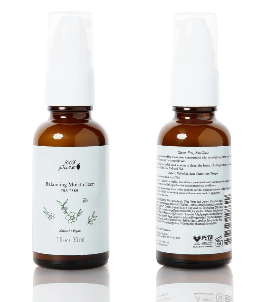 The 100% Pure Tea Tree Balancing Moisturizer is a lightweight, quick-absorbing moisturizer concentrated with acne-fighting herbs to refresh, soothe, and balance oily or acnegenic skin.