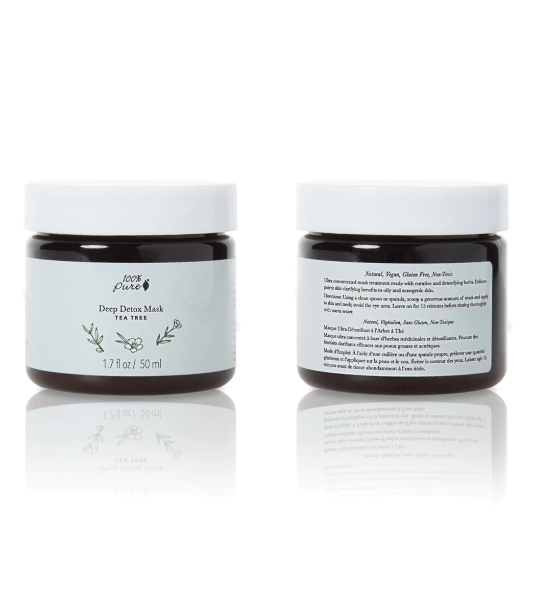 The 100% Pure Tea Tree Deep Detox Mask is an ultra-concentrated mask treatment made with curative and detoxifying herbs, designed to deeply purify oily and acnegenic skin. French green clay balances excess oil while purging the skin of pore-clogging debris and environmental pollutants. Salicylic acid, lactic acid, and turmeric reduce the appearance of acne scars and enhance radiance. A blend of peppermint and eucalyptus oils soothes redness and inflammation for a calm, refreshed complexion.