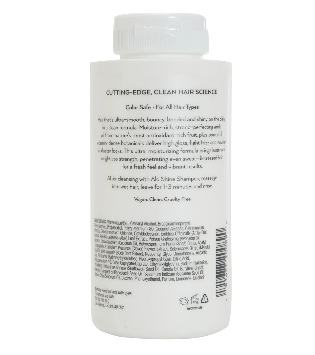 Hair thatβs ultra-smooth, bouncy and shiny on the daily with the Alo Yoga Shine Conditioner, 10 oz. Moisture-rich, strand-perfecting amla oil from natureβs most antioxidant-rich fruit, plus powerful, vitamin-dense botanicals deliver high shine, fight frizz and nourish lackluster locks. This ultra-moisturizing formula brings luster and weightless strength, penetrating even sweat-distressed hair for a fresh feel and vibrant results.