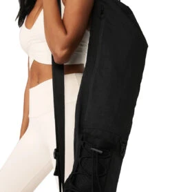 A yoga class necessity. The Utility Mat Bag is studio-street smart with a soft, adjustable shoulder strap and a top handle for easy carrying. Easily attach your keys with the carabiner hook and store small essentials in exterior grab-and-go mesh storage pockets.