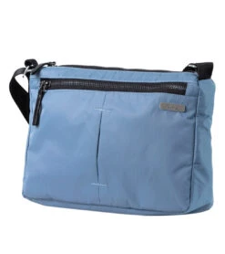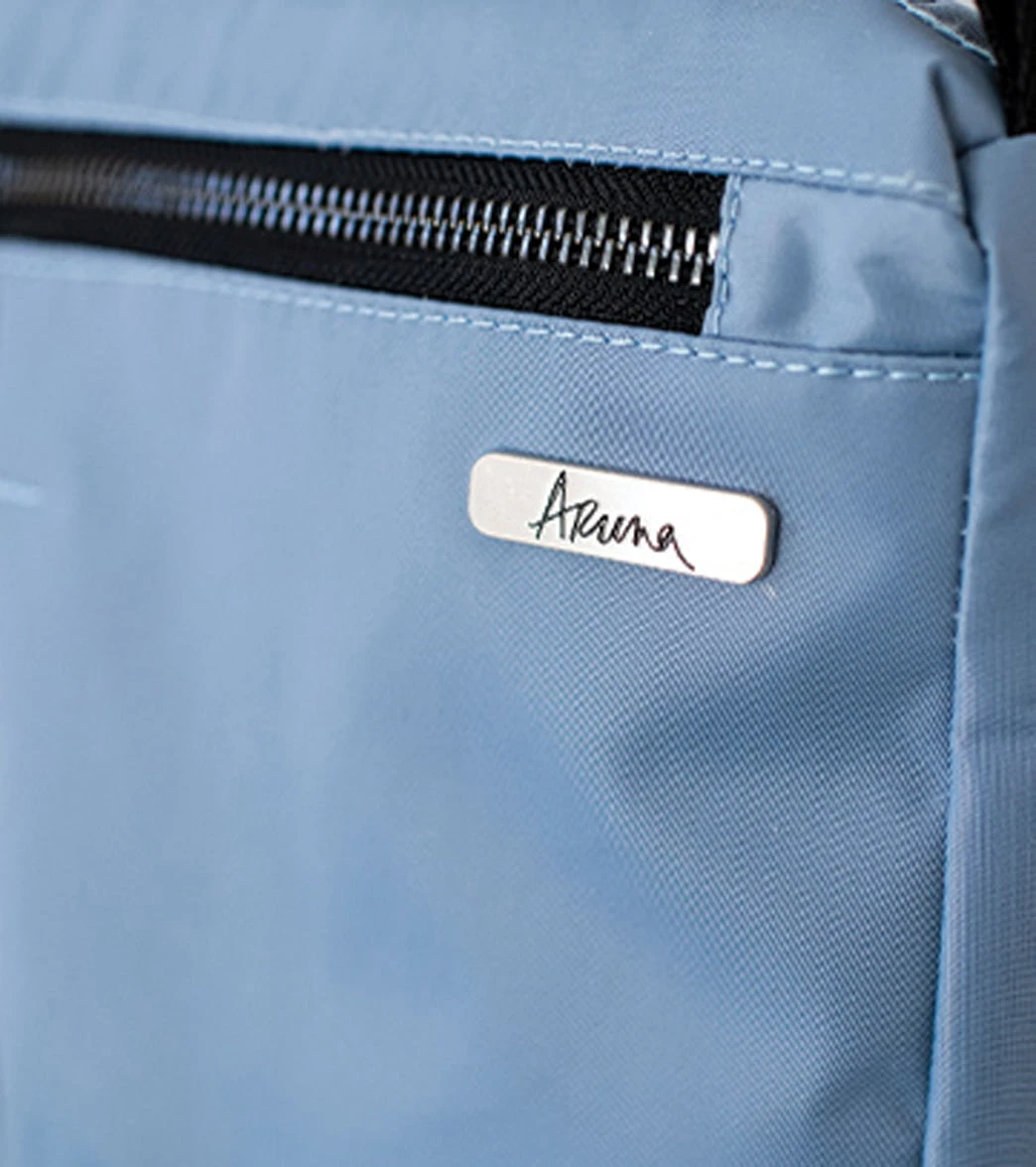 The Aruna Project Shree Crossbody is a water-resistant nylon crossbody bag with two interior and two exterior zip pockets, adjustable strap, and brushed silver metal hardware.