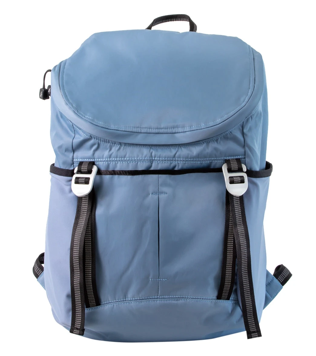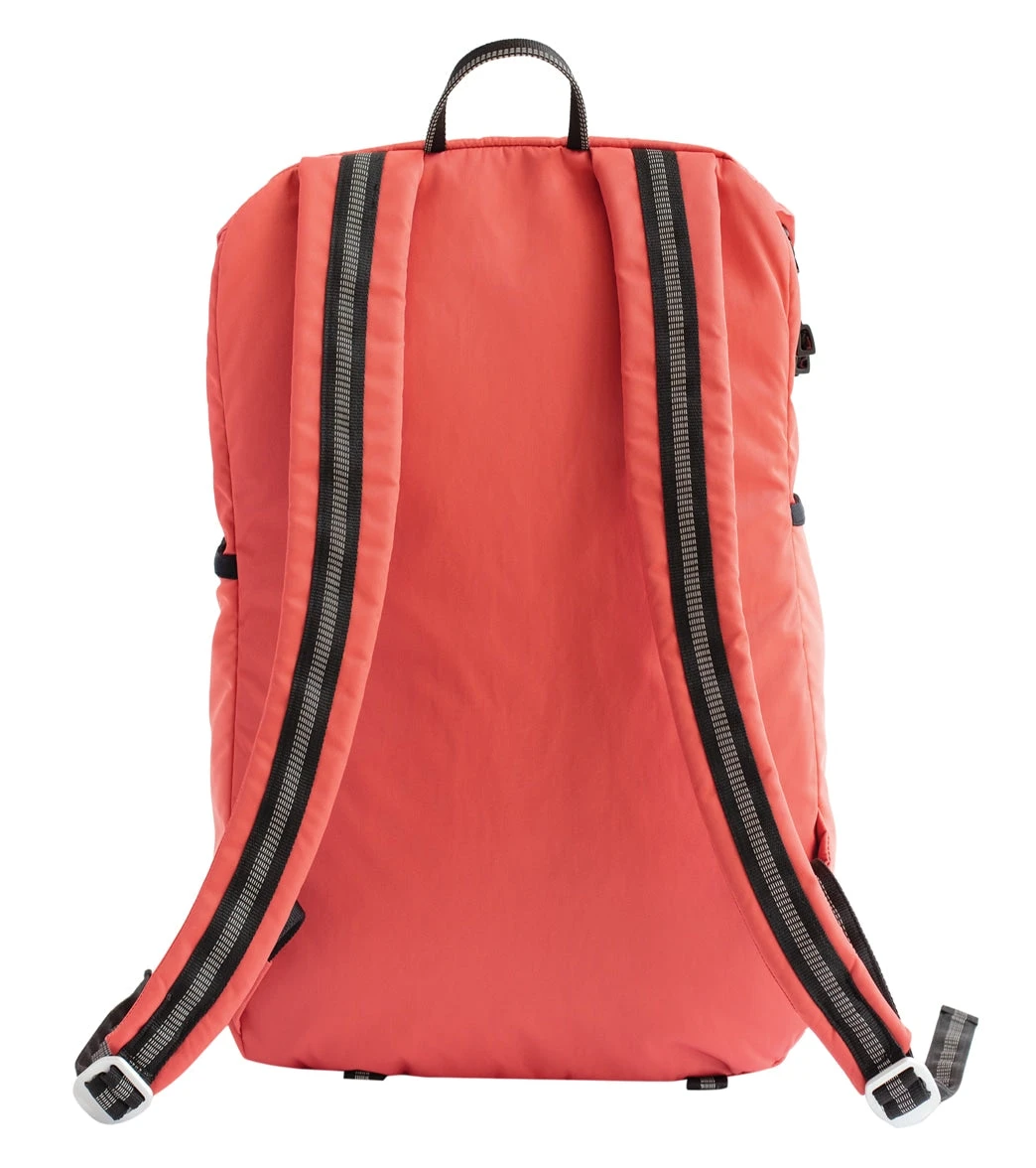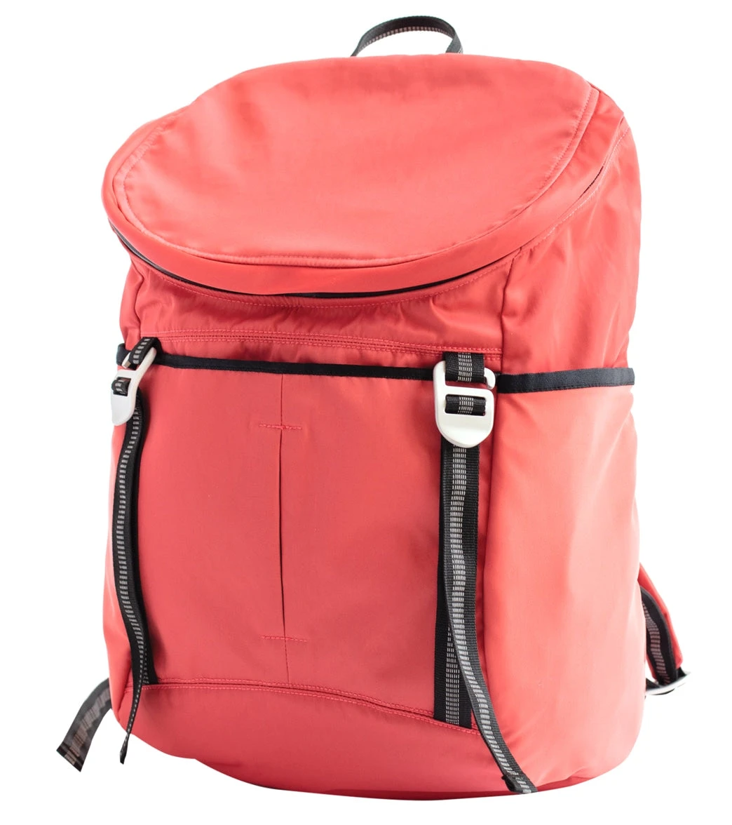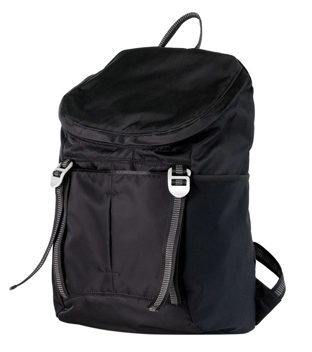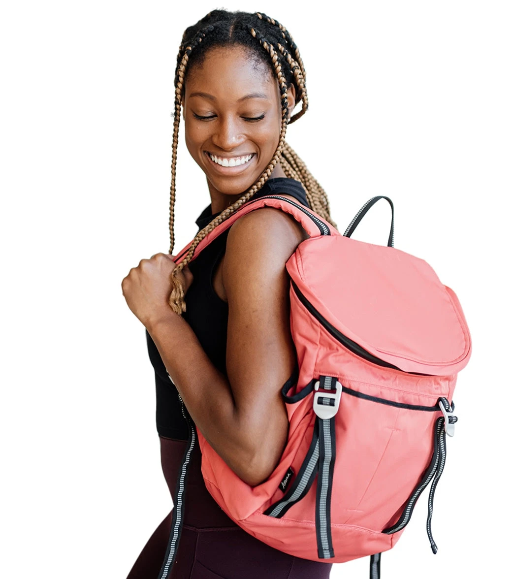 The Aruna Project Sonu Backpack is made of water-resistant nylon and features a water-repellent liner with the names of freed Aruna Artisans, a large main compartment, padded shoulder straps, and roll straps to hold a yoga mat or towel.