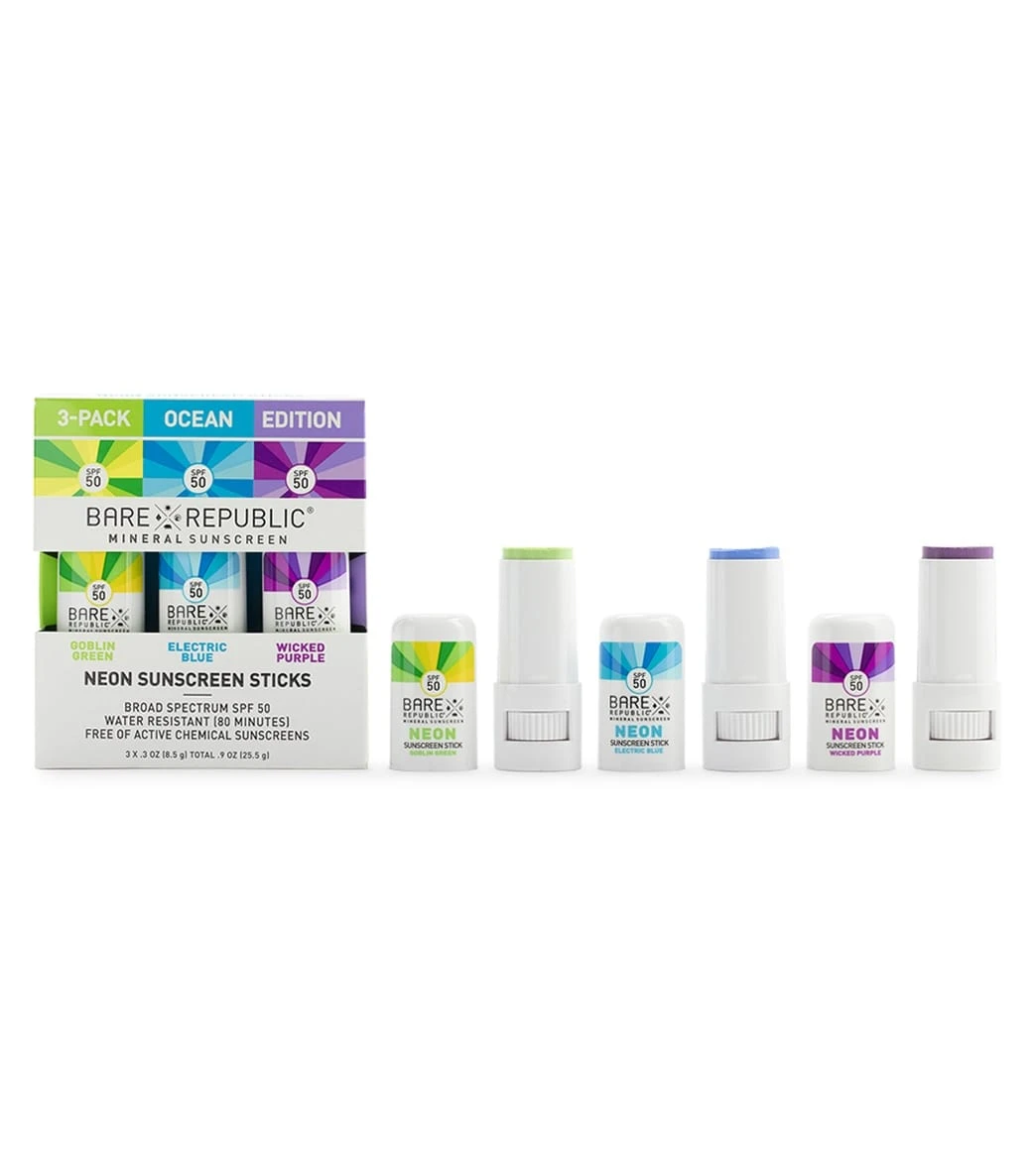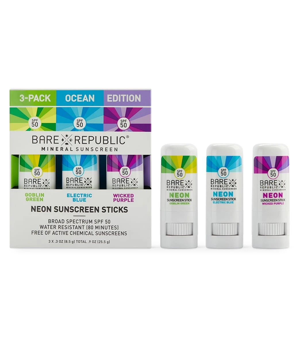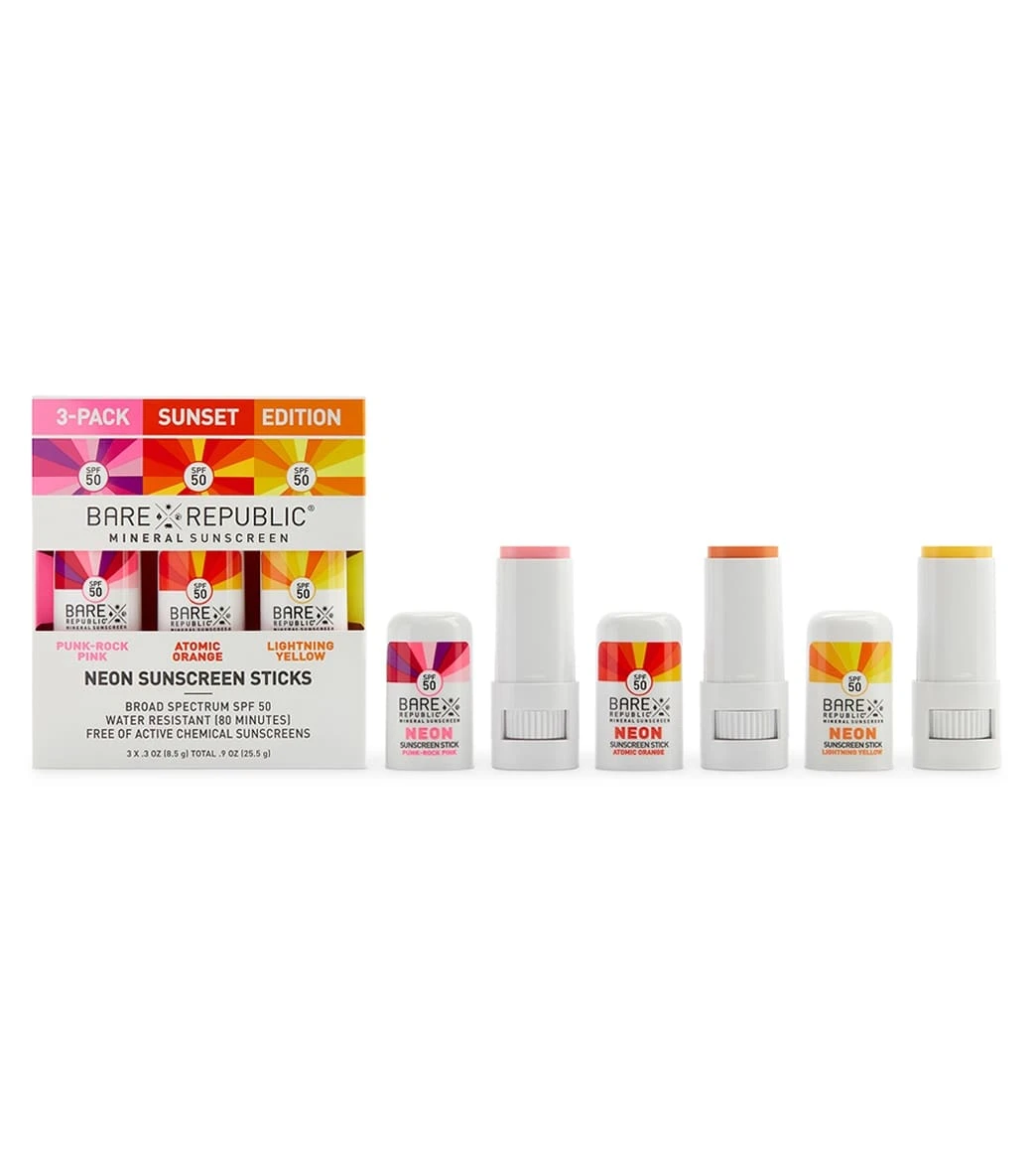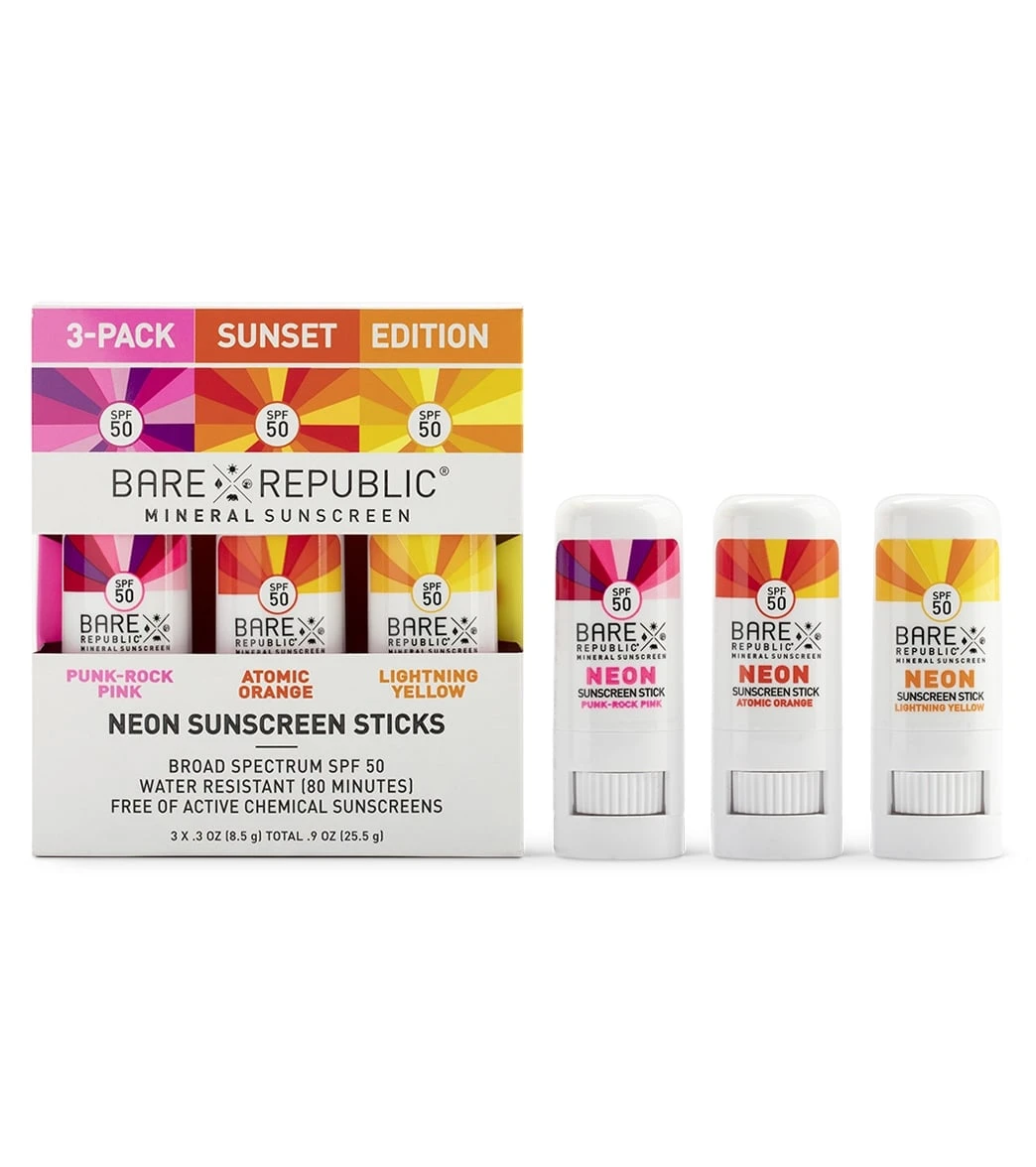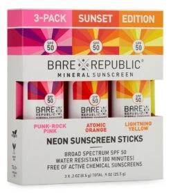 Protect your skin in style with the BARE Republic Mineral Neon SPF 50 Color Sport Stick 3 Pack