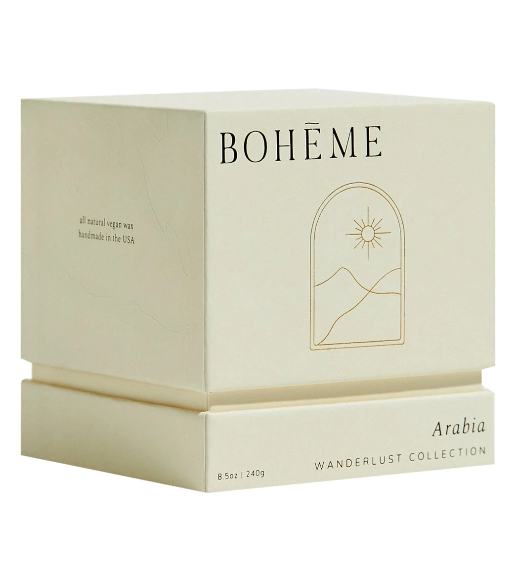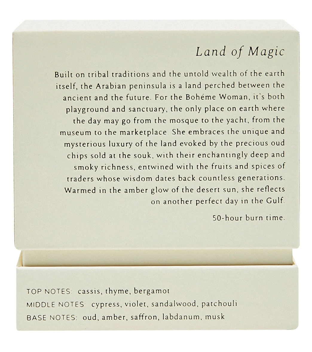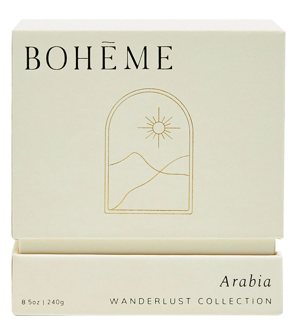 Built on tribal traditions and the untold wealth of the earth itself, the Arabian peninsula is a land perched between the ancient and the future. For the Boheme Woman, itโs both playground and sanctuary, the only place on earth where the day may go from the mosque to the yacht, from the museum to the marketplace. She embraces the unique and mysterious luxury of the land evoked by the precious oud chips sold at the souk, with their enchantingly deep and smoky richness, entwined with the fruits and spices of traders whose wisdom dates back countless generations. Warmed in the amber glow of the desert sun, she reflects on another perfect day in the Gulf. The Boheme Arabia candle invites you to experience this right in the comfort of your home.