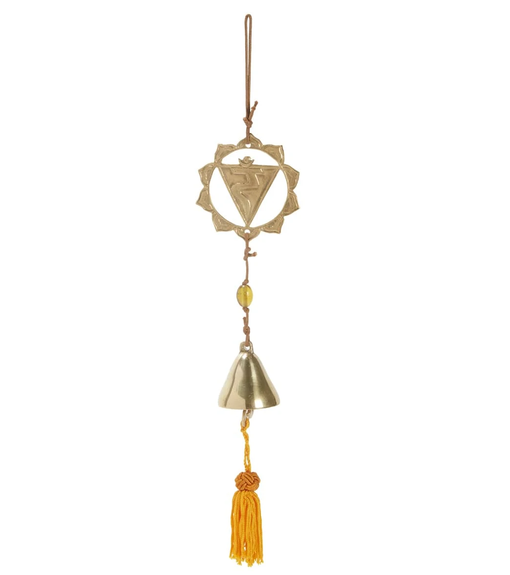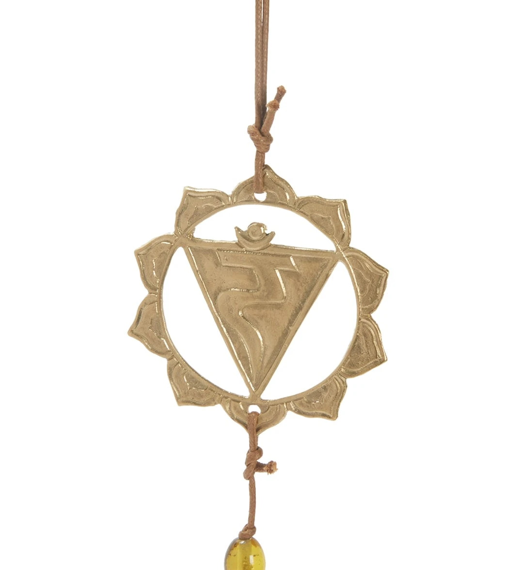 The dZi Door Chime: Crown Chakra features a solar plexus chakra symbol with color-appropriate glass bead and tassel.