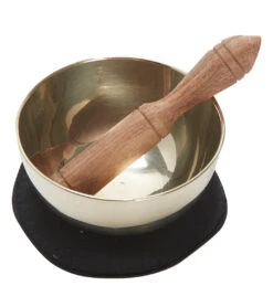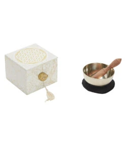 The dZi Meditation Bowl Box: 3″ Flower of Life includes a hand-cast brass bowl, cushion, wooden striker, and detailed info card in a sustainably-harvested, eco-friendly Lokta paper box.