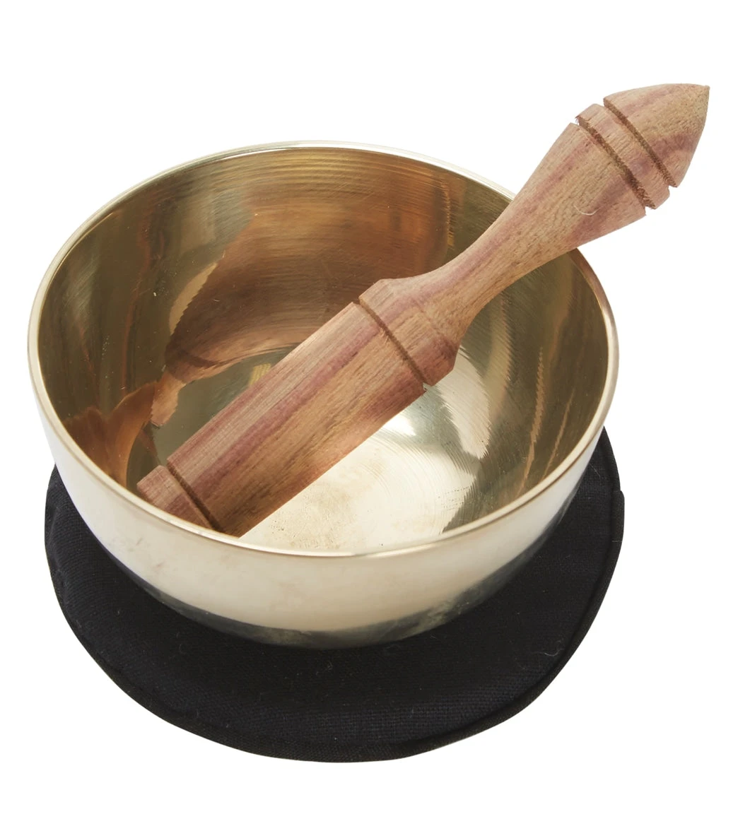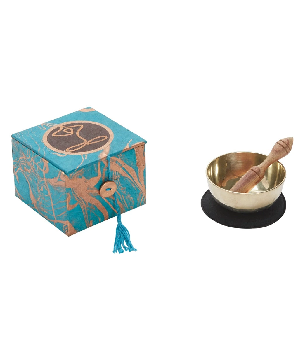 The dZi Meditation Bowl Box: 3″ Meditator includes a hand-cast brass bowl, cushion, wooden striker, and detailed info card in a sustainably-harvested, eco-friendly Lokta paper box.