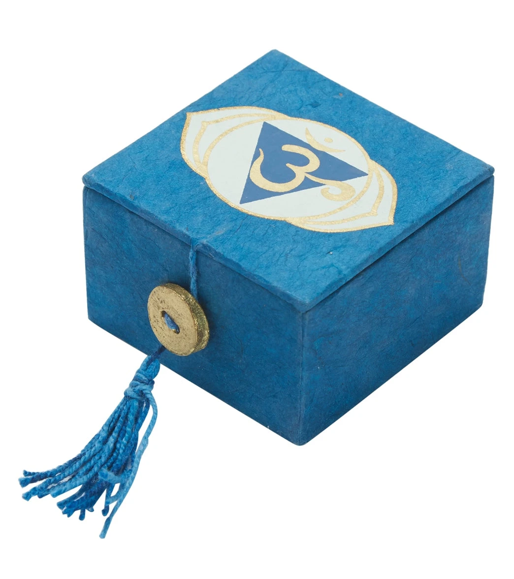 The dZi Mini Meditation Bowl Box: 2″ 3rd Eye Chakra includes a hand-cast brass bowl, cushion, wooden striker, and detailed info card, plus features the third eye chakra symbol on a color-appropriate, sustainably-harvested, and eco-friendly Lokta paper box.