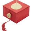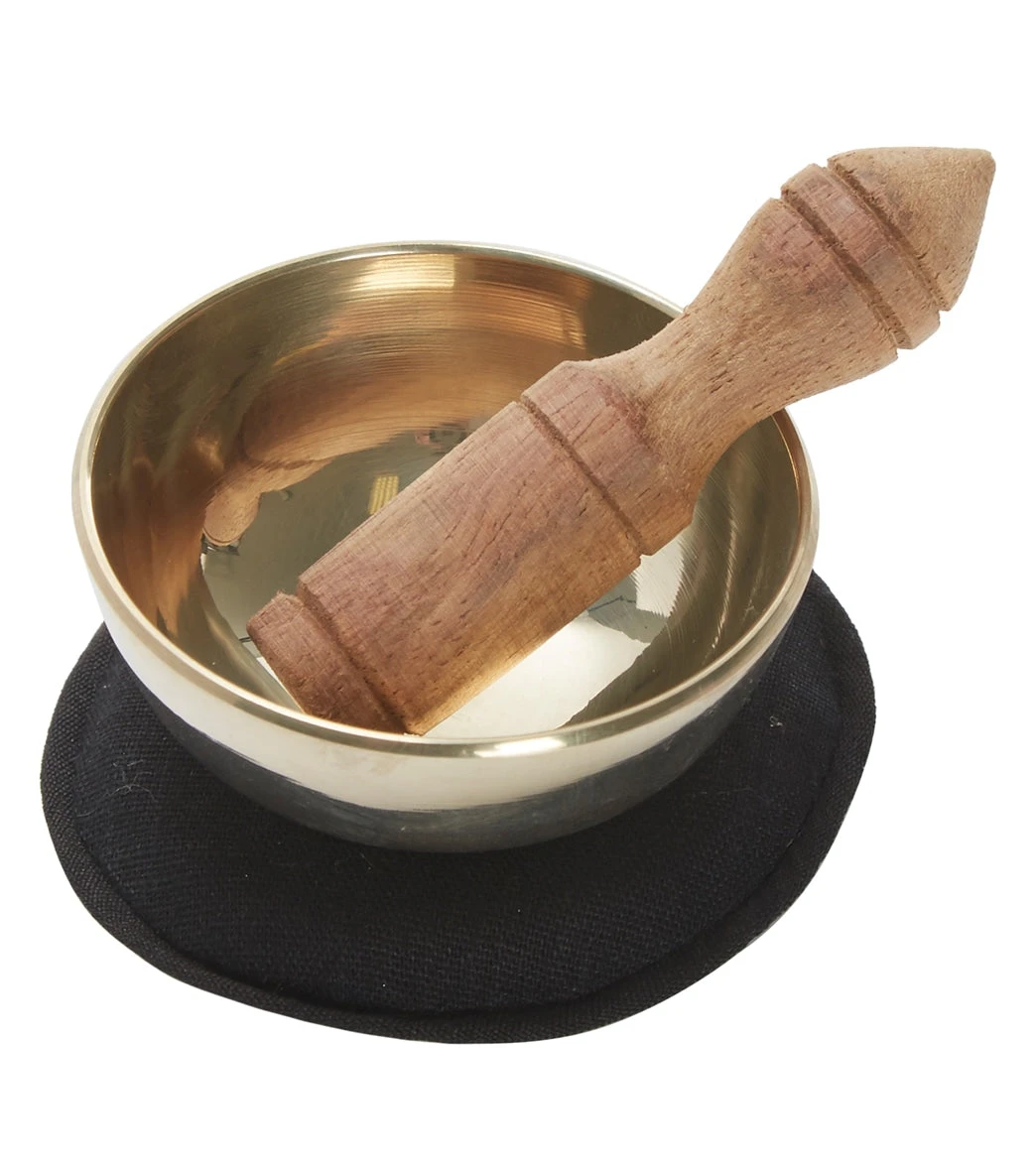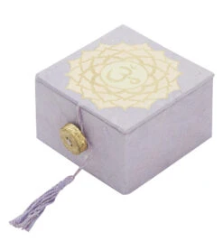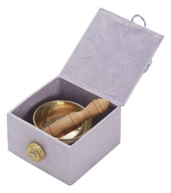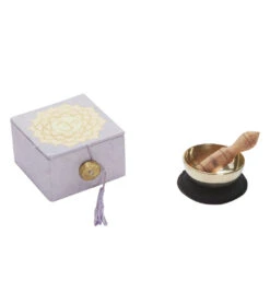 The dZi Mini Meditation Bowl Box: 2″ Crown Chakra includes a hand-cast brass bowl, cushion, wooden striker, and detailed info card, plus features the crown chakra symbol on a color-appropriate, sustainably-harvested, and eco-friendly Lokta paper box.