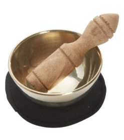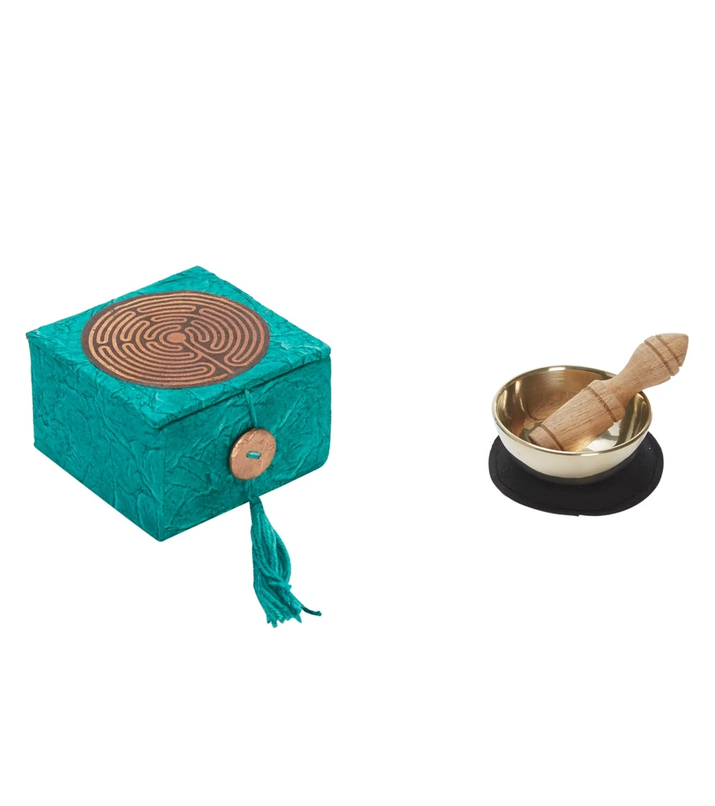 The dZi Mini Meditation Bowl Box: 2″ Garden Labyrinth includes a hand-cast brass bowl, cushion, wooden striker, and detailed info card in a sustainably-harvested, eco-friendly Lokta paper box.