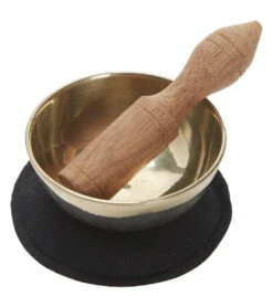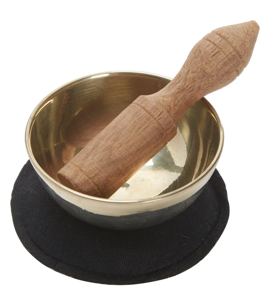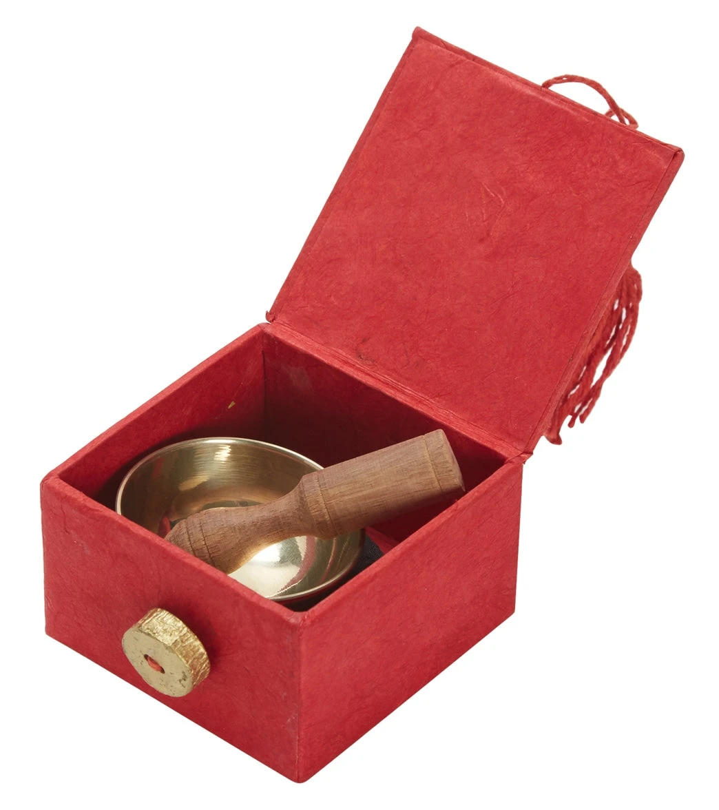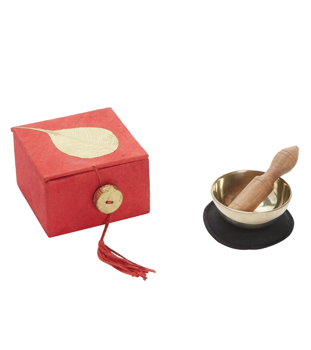 The dZi Mini Meditation Bowl Box: 2″ Gold Bodhi includes a hand-cast brass bowl, cushion, wooden striker, and detailed info card in a sustainably-harvested, eco-friendly Lokta paper box featuring a gold-leafed bodhi leaf.