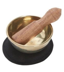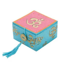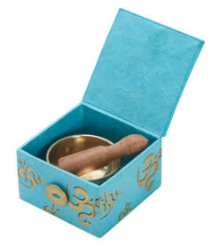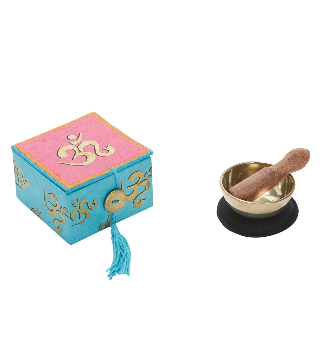 The dZi Mini Meditation Bowl Box: 2″ Om includes a hand-cast brass bowl, cushion, wooden striker, and detailed info card in a sustainably-harvested, eco-friendly Lokta paper box.