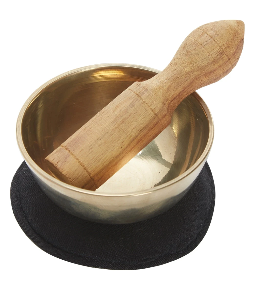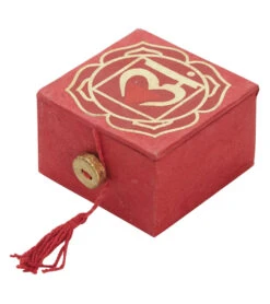 The dZi Mini Meditation Bowl Box: 2″ Root Chakra includes a hand-cast brass bowl, cushion, wooden striker, and detailed info card, plus features the root chakra symbol on a color-appropriate, sustainably-harvested, and eco-friendly Lokta paper box.