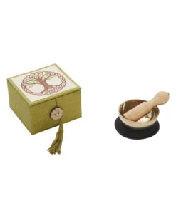 The dZi Mini Meditation Bowl Box: 2″ Tree Of Life includes a hand-cast brass bowl, cushion, wooden striker, and detailed info card in a sustainably-harvested, eco-friendly Lokta paper box.