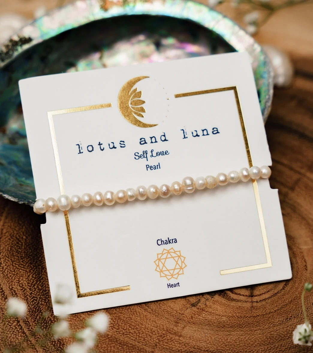 Having long been admired as symbols of beauty, innocence, and faith, ruled by the tides and cycles of the moon, the energy of pearls enlightens the mind, improves mood, and promotes self-love. Associated with the crown chakra, the Lotus and Luna Self Love Pearl Healing Bracelet offers the positive affirmation: “I LOVE AND ACCEPT MYSELF AS I AM.”