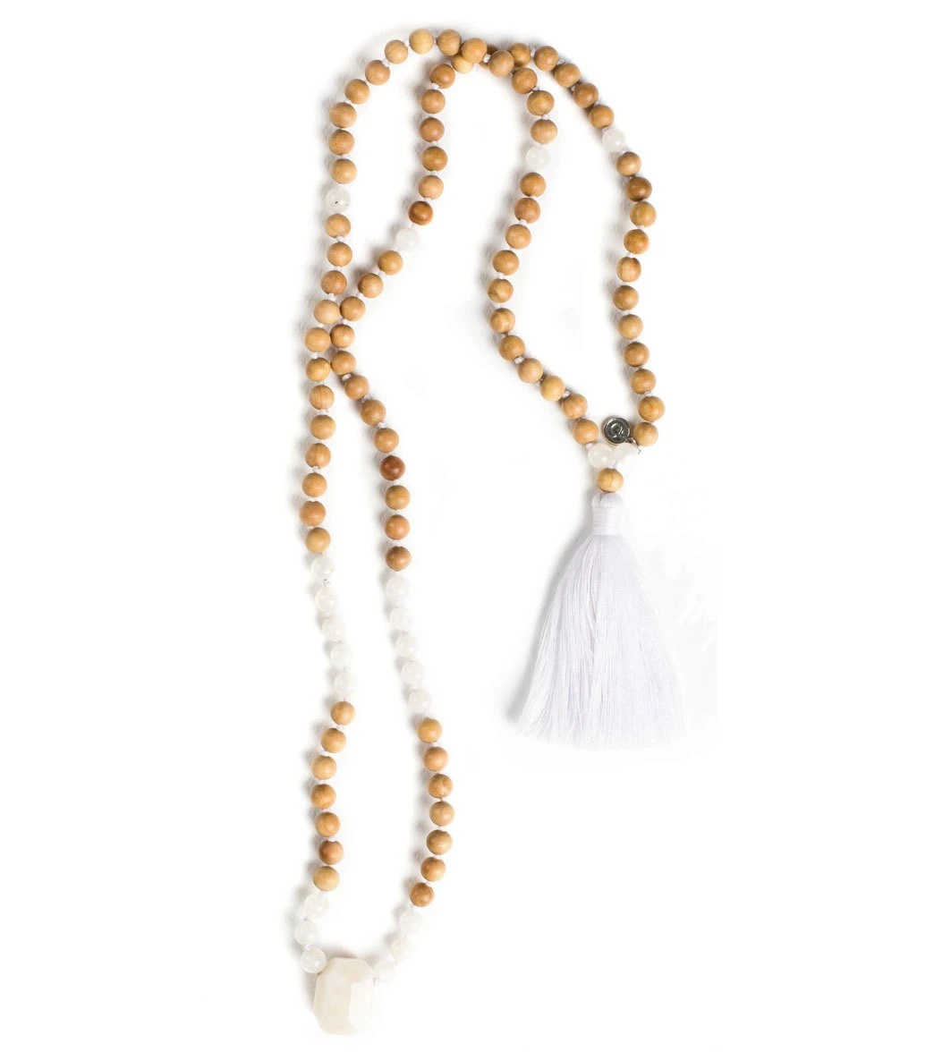 Clear your mind with the Mala Collective Mala Inviting Clarity Japa Mala Necklace. Sandalwood and White Moonstone gemstones provide a combination of calm, tranquil energy that aids your on your journey.