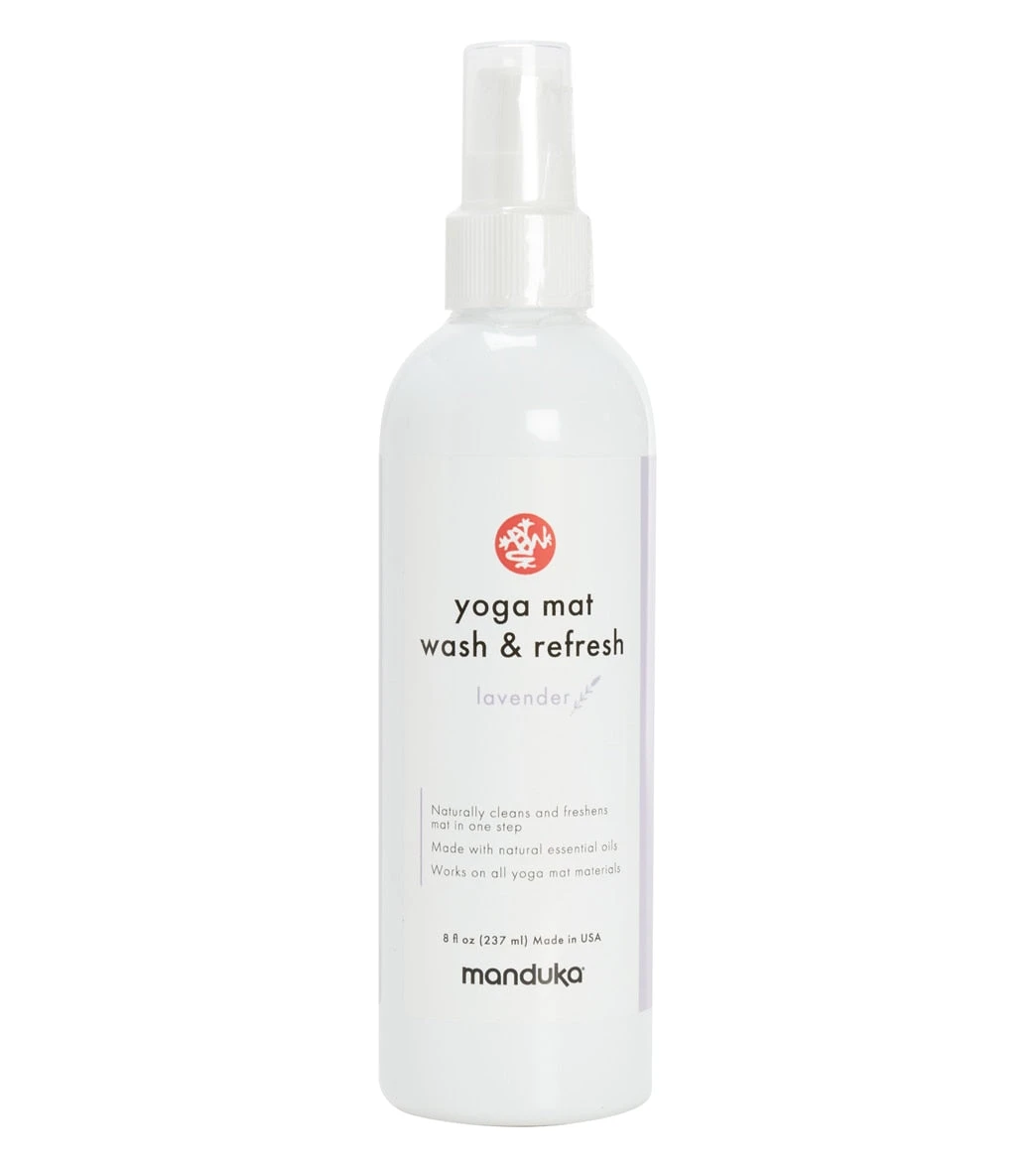 The Manduka Yoga Mat Wash & Refresh, 8 oz uses 100% naturally derived ingredients, formulated to keep your yoga mat smelling fresh and free from surface dirt and stains. Use it after every class to keep your mat clean and odor-free.