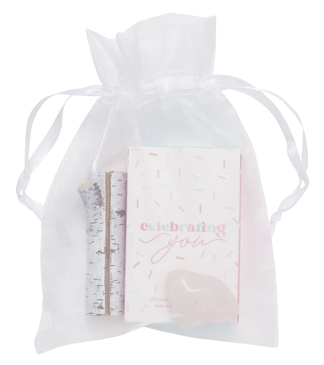 The May You Know Joy May You Know Joy Celebrating You gift set is the perfect companion to any new beginning in life. Sometimes we choose new beginnings and other times they happen anyway. Whether it’s a new lifestyle choice, opportunity, adventure, city, job, home, or relationship, this deck inspires us to embrace the magic and possibilities of a fresh start. Each gift set includes a mini card deck, a birch bark card stand, a rose quartz crystal for energy clearing and to promote self-love and an instruction card. All items come in a white, organza, draw-string bag.