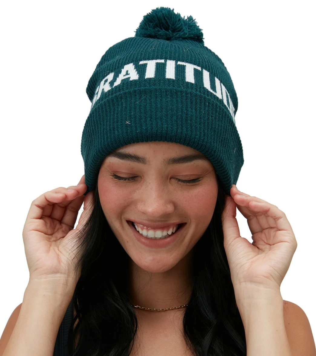 The best-selling beanie is back, and softer than ever. Updated for the season in a deep pine and embellished with “Gratitude” intarsia knit details, the Spiritual Gangster Gratitude Pom Pom Beanie keep you feeling warm and looking cool during the winter months.