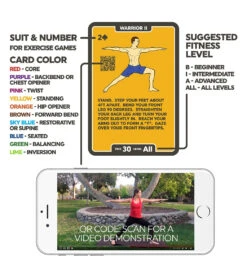 - 52 essential yoga poses on enlarged suited and numbered playing cards