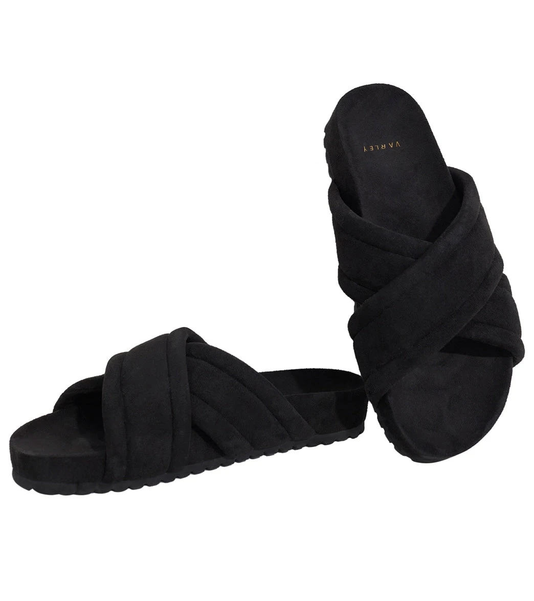 From city strolls to beach days, the Varley Ronley Quilted Slides 2.0 in Black and Mink Stone have got you covered with plush faux suede and cushioned straps.