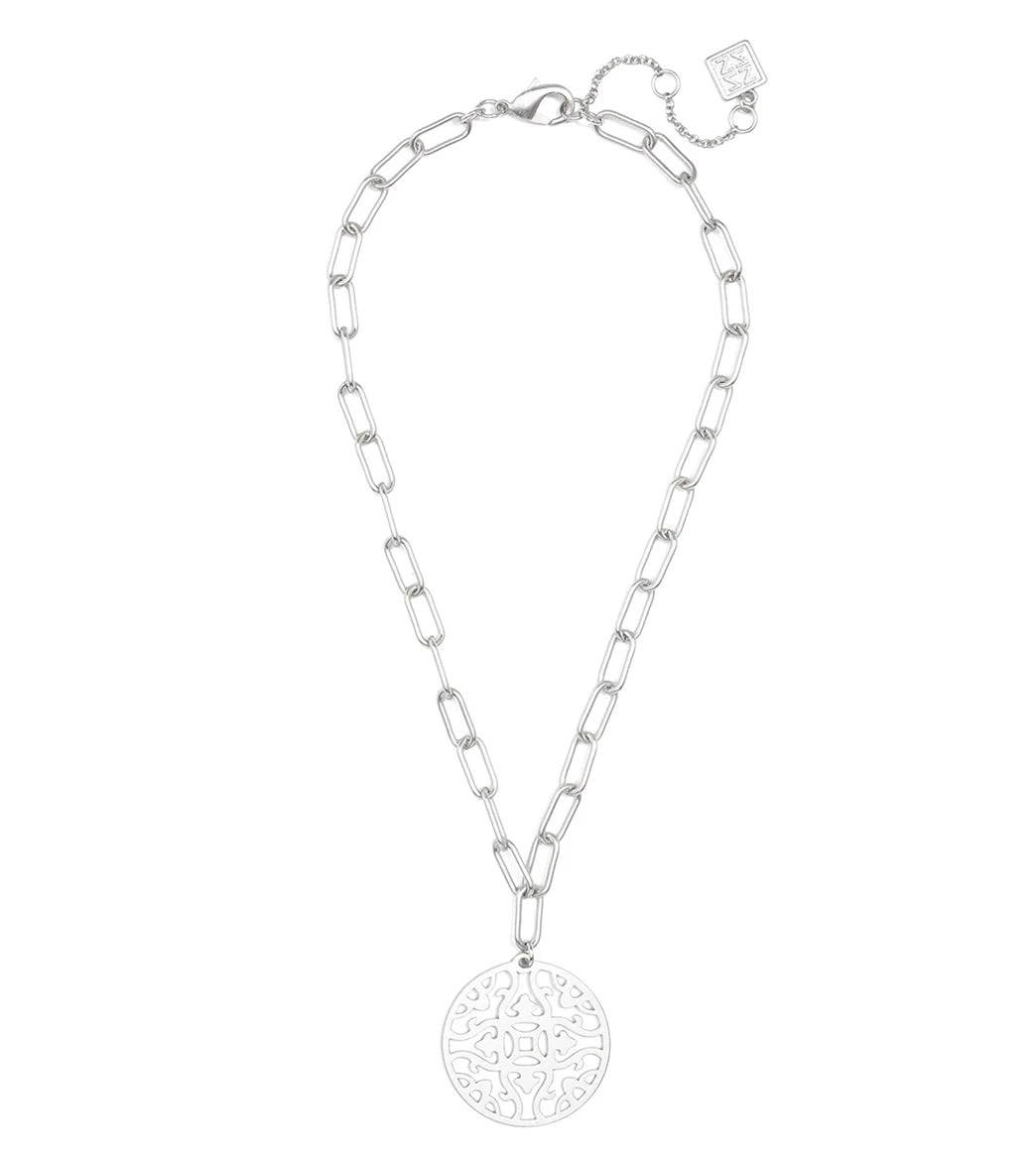 Complement your necklace stack with the Zenzii Emblem Pendant And Chain Collar Necklace. This style feature matte links with an intricate, laser-cut pendant.
